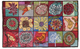 Vibrant rug. Early American design of squares. Within each square is either a Rose, or a striped boxes full of color. The Roses are very red, leaves of greens surround it and the roses lie on a black and brown field. The stripped squares are VIBRANT royal blue, navy blue, beige, white, and red.