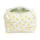 The quilted exterior features a beautiful lemon-themed pattern, complemented by a classy striped green interior.