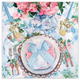 In shades of blush pink and sage green, a flowering apple blossom tree frames a hummingbird, a bluebird, and a butterfly. Soft sprouts of grass frame the bottom of the scene.
