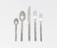 The Aladdin Antique Five-Piece Place Setting features elegant pearlized handles with the strength of high-grade acrylic and 18/10 stainless steel. The handles are wrapped with intricate lattice metalwork.