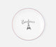 In shades of blush pink and sage green, a flowering apple blossom tree frames a hummingbird, a bluebird, and a butterfly. Soft sprouts of grass frame the bottom of the scene.