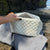 The quilted exterior is made with a soft cream waffle material, complemented by the unique floral interior.