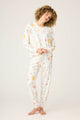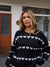 A relaxed crew-neck knitted sweater featuring rows of heart motifs.