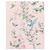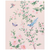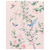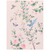 In shades of cornflower blue, blush pink, and sage green, flowering cherry and peony blossoms frame a hummingbird, a blue bird, and a butterfly.