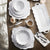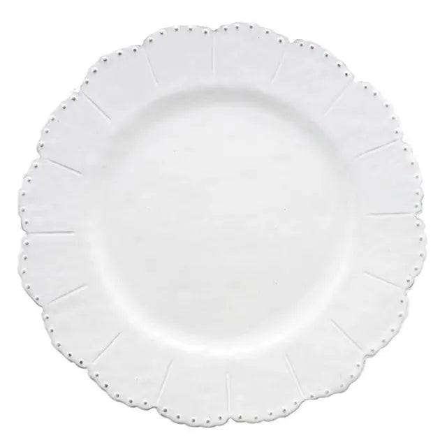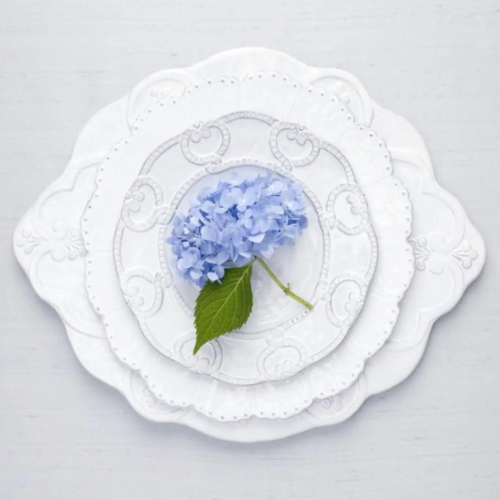 This dinnerware was created by an Italian fashion designer then hand-crafted using a delicate white glaze over stoneware. The beautiful details create an elegant, unique addition to any table. Italian Stoneware, Hand made in Italy.