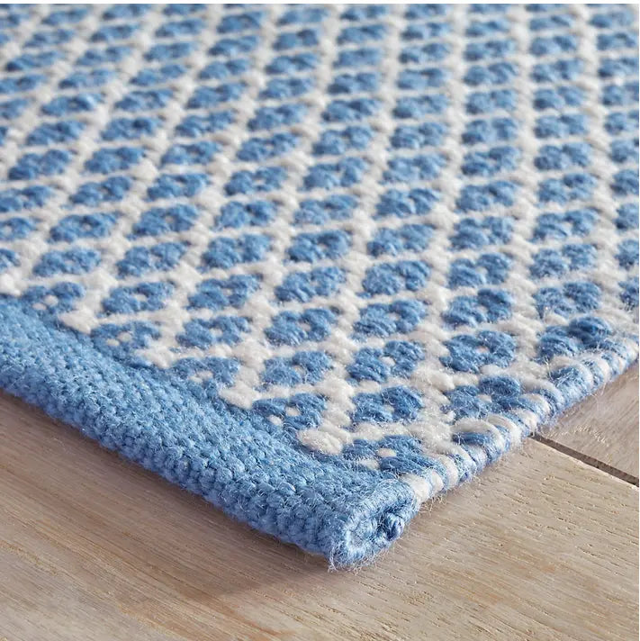 A classic lattice diamond in versatile blue and ivory color combo offers subtle geometric interest on a durable and washable floor covering. Made of eco-friendly 100% PET, a soft-handed fiber from recycled plastic bottles. Crafted by artisans committed to fair-labor practices.