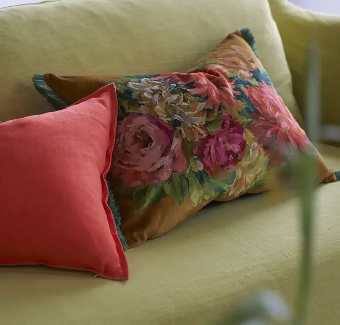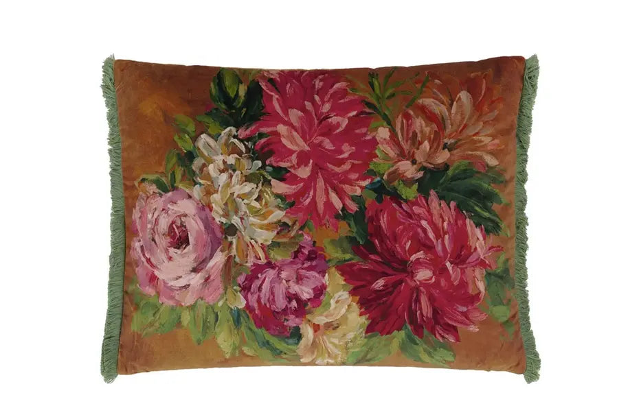 Large scale full - blown roses and dahlias are hand painted with dynamic strokes for this stylish large rectangular decorative pillow. Creating a joyful and vibrant celebration of the inspiration of flowers. In soft vintage green tones, this decorative pillow is digitally printed onto luxurious velvet and finished with a fringed trim in ochre on two sides.