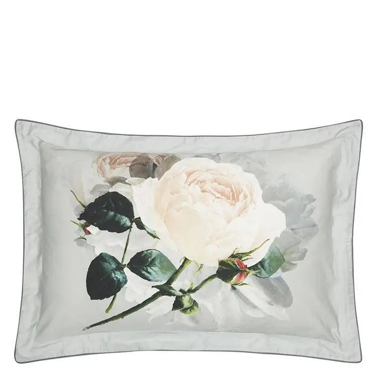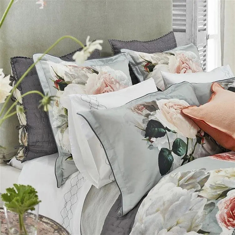 This beautiful Peonia Grande Zinc Sham from Designers Guild features 300 thread count all cotton sham with romantic peonies that are arranged in a dramatic layout on a soft gray ground to create a modern and relaxed floral bedding.
