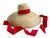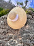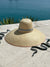 The extra-wide brim sun hat is woven, like a basket, with dried palm tree leaves.Β