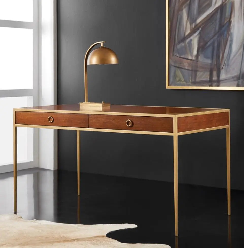 This classic Mid-Century Modern Carlton Writing desk from Modern History is made of solid oak with walnut veneer.Β Finished with an iron gold leaf frame makes this a statement piece in an office, as a writing desk in a living room or in a hallway.