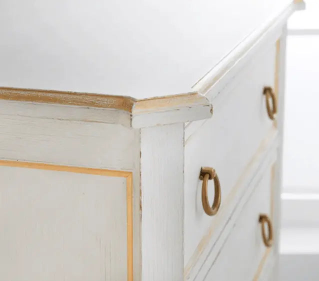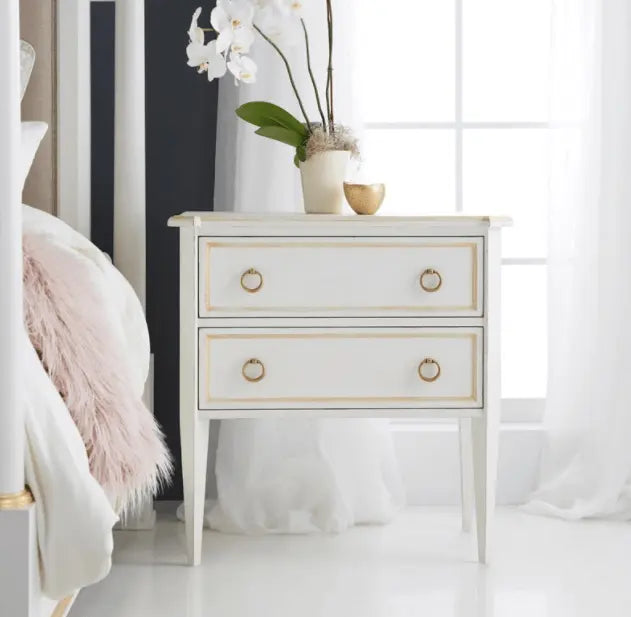 The Covington Bedside Chest is stunning with a beautiful white painted finish with gold leaf detailing. Finished off with brass tapered ring pulls for a touch of luxury in any room. Indulge in the luxury of a beautifully curated space with the Covington Bedside Chest. Its stunning design boasts a white painted finish with delicate gold leaf detailing, exuding an air of sophistication and elegance. The brass tapered ring pulls add an exquisite finishing touch, making this piece a must-have for any room.