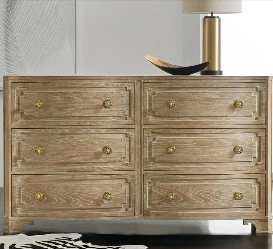 This newest introduction from Modern History features an oak random veneer with solid brass hardware. The detail of this dresser is absolutely stunning from the grain of the oakwood to slightly curved drawers with beautiful hardware, this piece is a true example of expert craftsmanship. With six spacious drawers this dresser is perfect for a bedroom or for a dining room to store your linens.Β