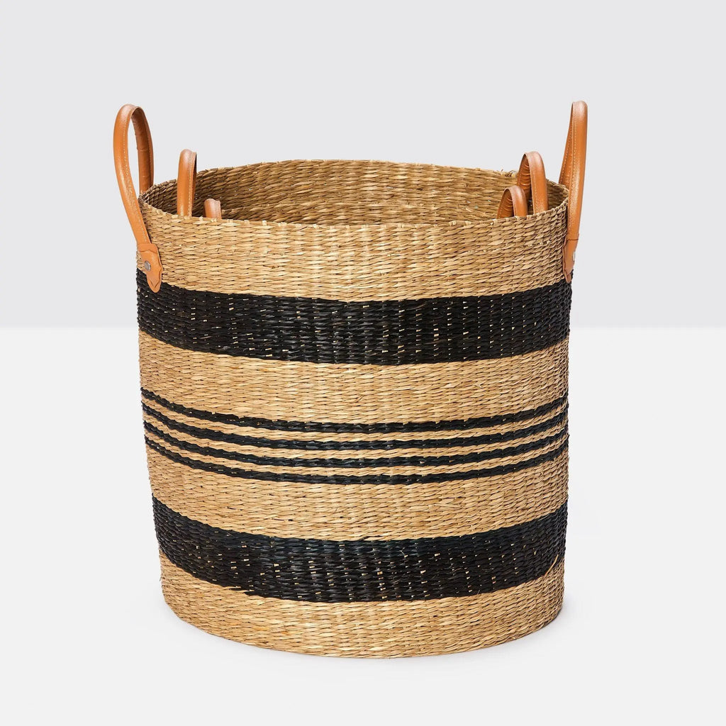 The Hudson Baskets are made from seagrass and come in a set of three. Tall and striped, these baskets feature a tight weave and sturdy leather handles. Perfect for storing items in your bedroom, living room or office space.Β