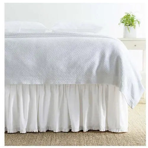 Sweet dreams! Bedtime doesn't get any sweeter than this combination of a smooth cotton bed skirt and a flirty ruffle for a more sophisticated look. Gathered; split corners, 18" drop.