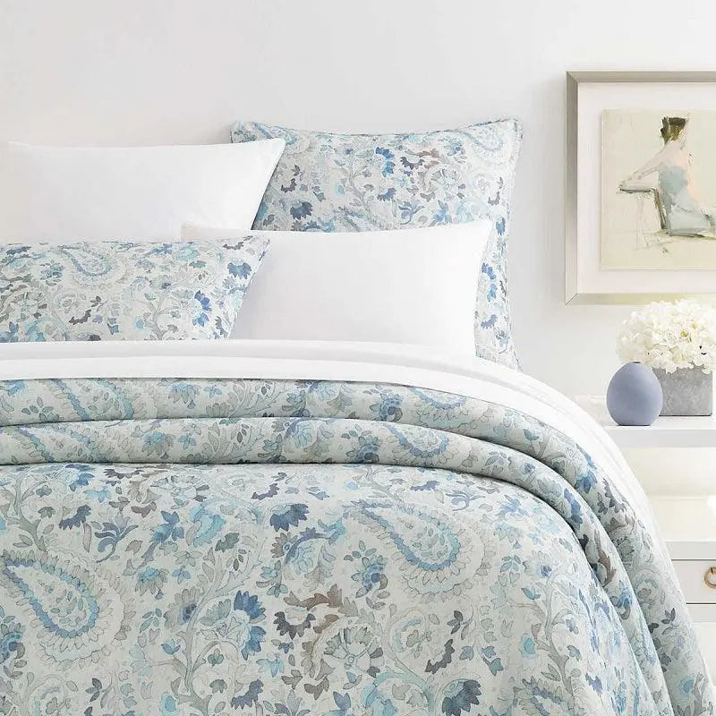 Ines Blue is easy to love; the rhythmic and lyrical paisleys, florals and foliage dance together in washes of blue, indigo and charcoal on a rustic laundered linen ground. Washed and tumbled for sublime softness and drape. Wake up to the colors of an ocean breeze and slip into the new day feeling refreshed and relaxed.