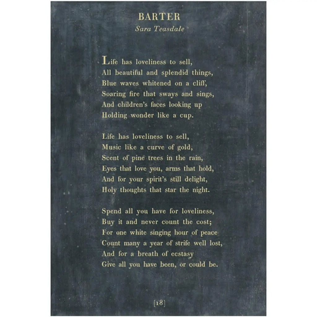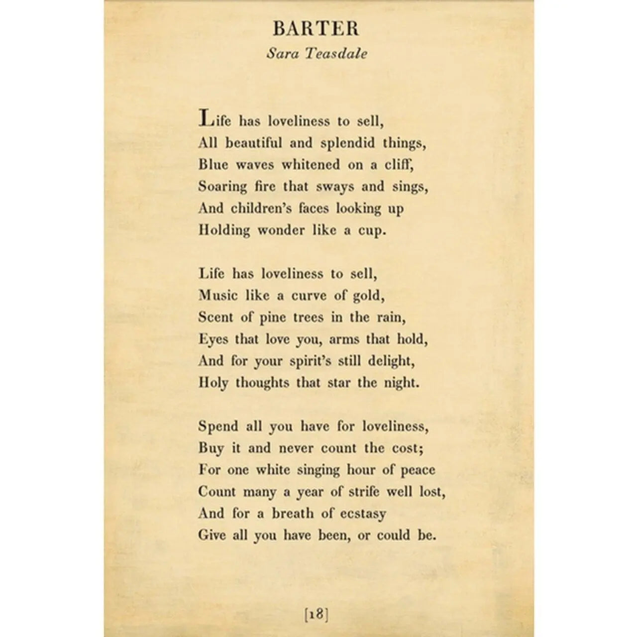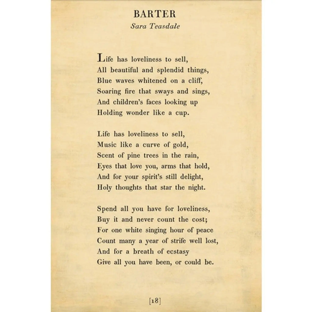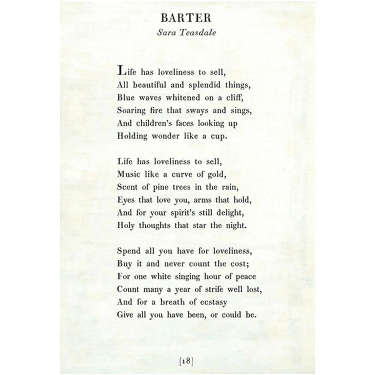 Life has loveliness to sell, All beautiful and splendid things, Blue waves whitened on a cliff, Soaring fire that sways and sings, And children's faces looking up Holding wonder like a cup Life has loveliness to sell, Music like a curve of gold, Scent of pine trees in the rain, Eyes that love you, arms that hold, And for your spirit's still delight, Holy thoughts that star the night. Spend all you have for loveliness, Buy it and never count the cost; For one white singing hour of peace Count many a year of strife well lost, And for a breath of ecstasy Give all you have been, or could be. β Sara Teasdale