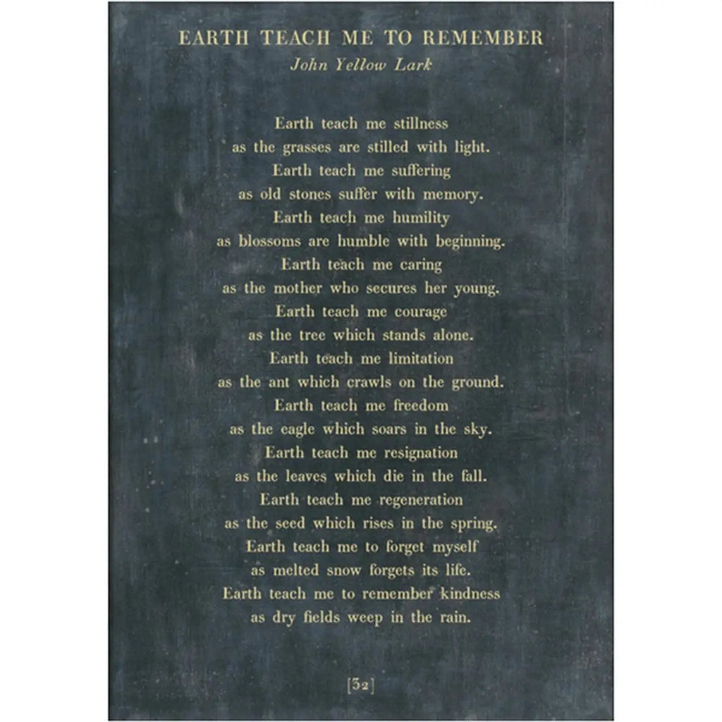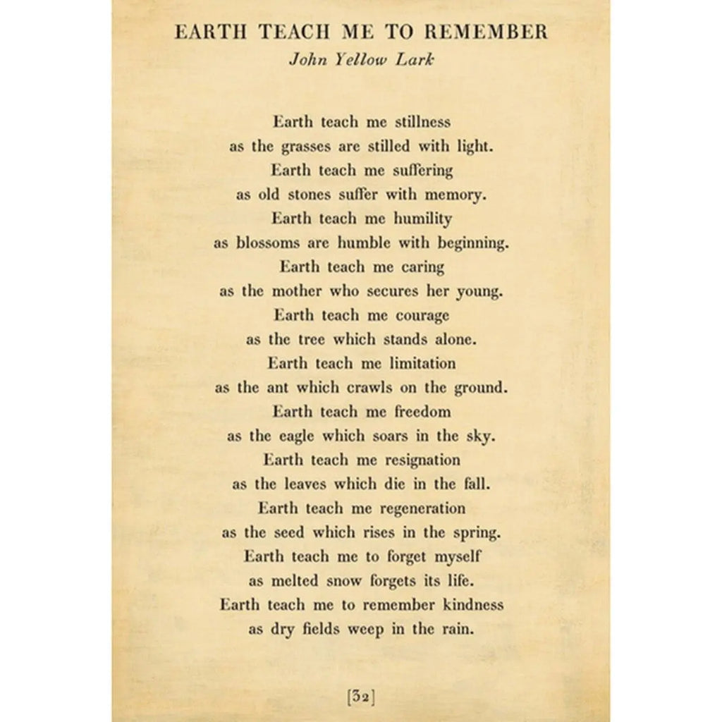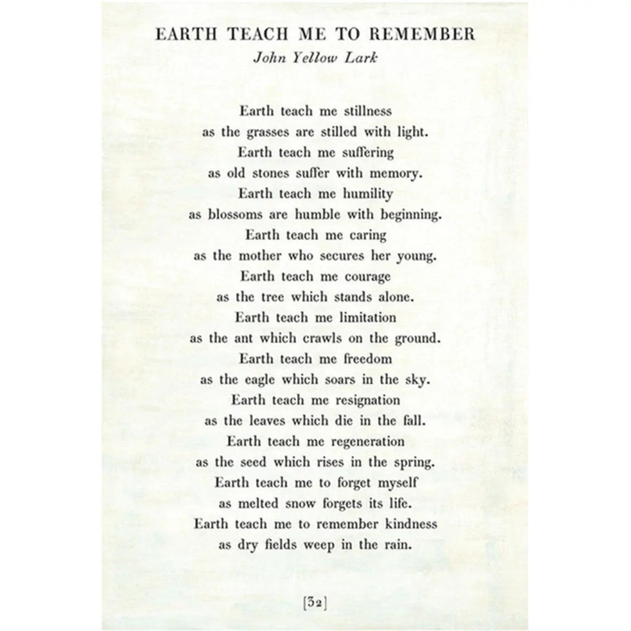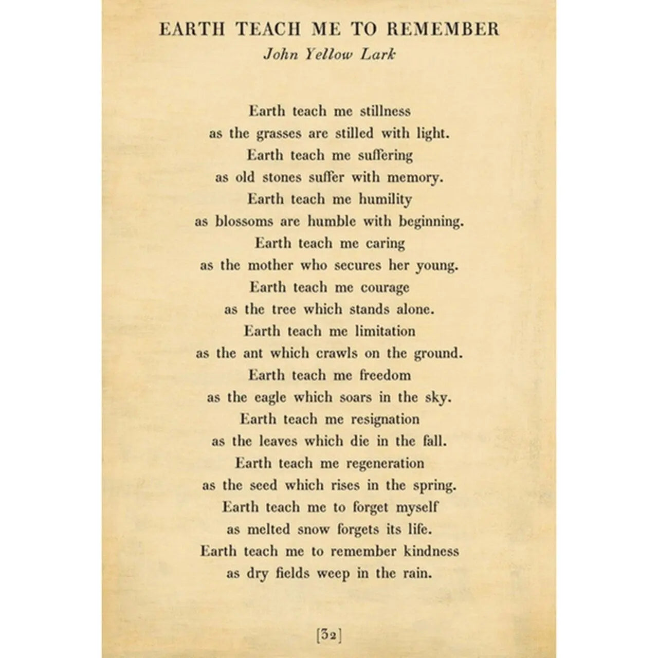 Earth teach me stillness as the grasses are stilled with light. Earth teach me suffering as old stones suffer with memory. Earth teach me humility as blossoms are humble with beginning. Earth teach me caring as the mother who secures her young. Earth teach me courage as the tree which stands alone. Earth teach me limitation as the ant which crawls on the ground. Earth teach me freedom as the eagle which soars in the sky. Earth teach me resignation as the leaves which die in the fall. Earth teach me regeneration as the seed which rises in the spring. Earth teach me to forget myself as melted snow forgets its life. Earth teach me to remember kindness as dry fields weep in the rain. β€” John Yellow Lark