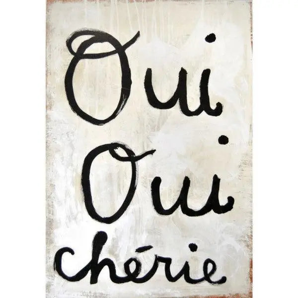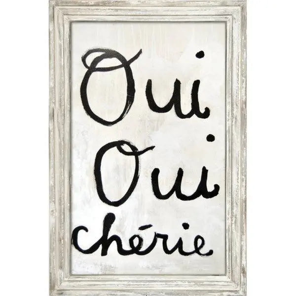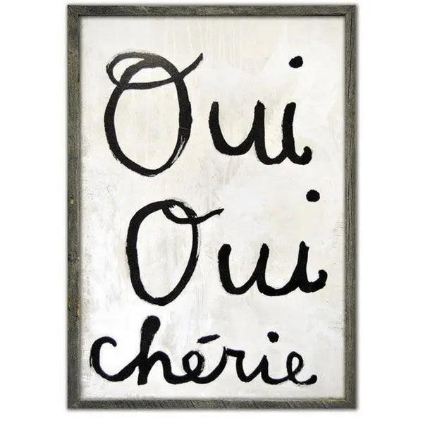 This simple art print says, "Oui oui chΓ©rie" in a black font on a white background. Each print is framed using vintage recycled wood and comes ready to hang. Made in USA.