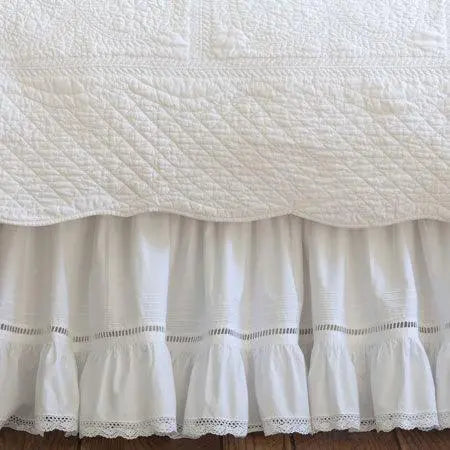 Bring a touch of elegance to your bedroom with Taylor Linens Prairie Crochet Bed Skirt. Its intricate crochet lace, hemstitching, and abundant pintucks offer luxurious texture and a sophisticated look. Crafted from 100% cotton mill percale and machine washable, this high-quality bed skirt offers both classic beauty and convenience.